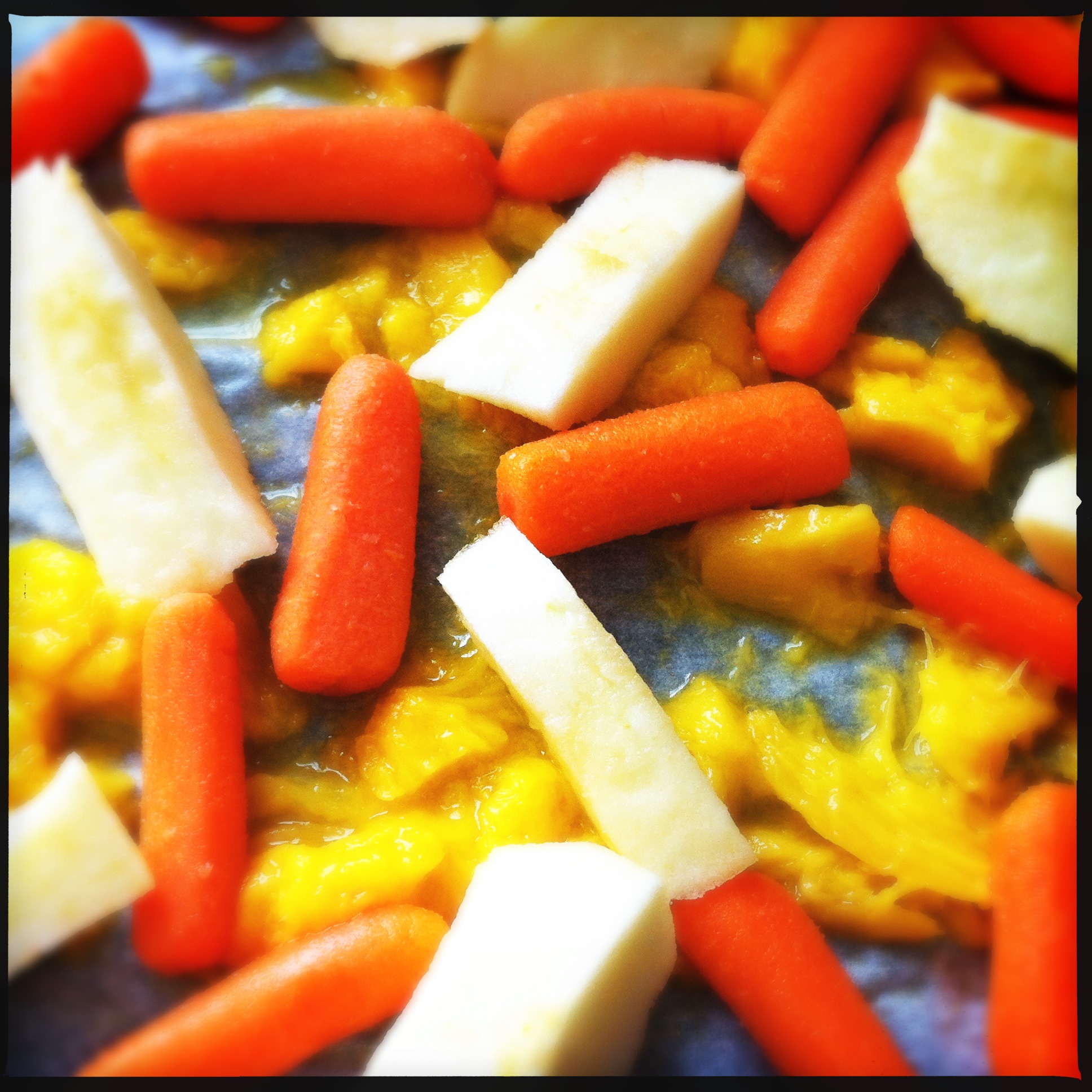 Preheat oven to 350 degrees. Line a sheet pan with parchment paper. Peel and core the apples then cut into quarters, peel and cut the mango into chunks, rinse the carrots, and arrange the fruit & veg in a single layer on the prepared pan.