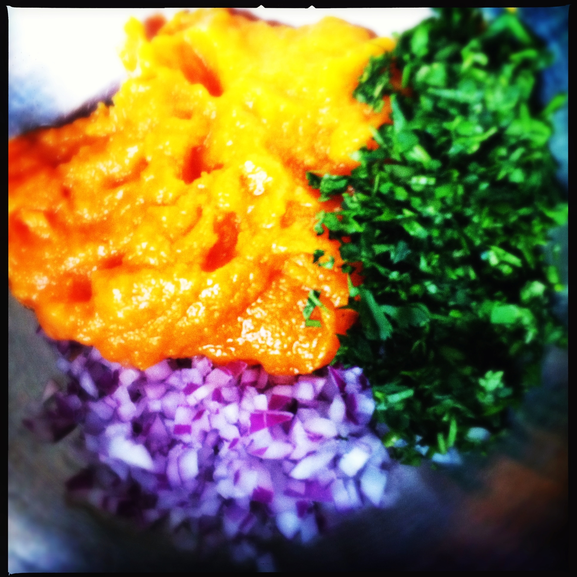 Line a sheet pan with wax or parchment paper. Dice onion and chop cilantro and garlic. In a small mixing bowl combine onion, garlic, cilantro and fruit/veg puree.