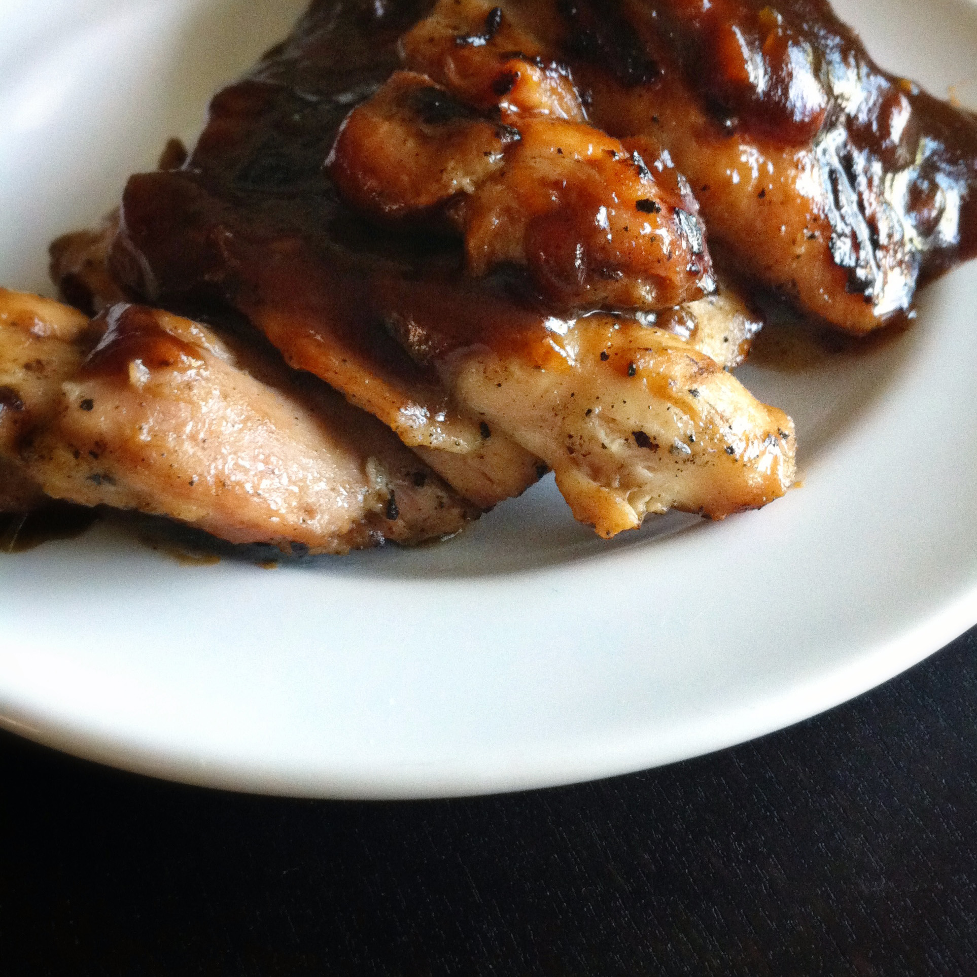 Clean the chicken of any grossness and brush with a little olive oil, sprinkle with salt & pepper. Grill chicken slowly with the lid closed, flipping only once (around 10 – 15 minutes for small thighs. Brush liberally with sauce during the last 5 minutes. The sauce has a lot of natural sugars so it will burn if you brush it on the chicken too early. Transfer chicken to plate and cover with foil to rest for 5 – 10 minutes. Serve with additional sauce.