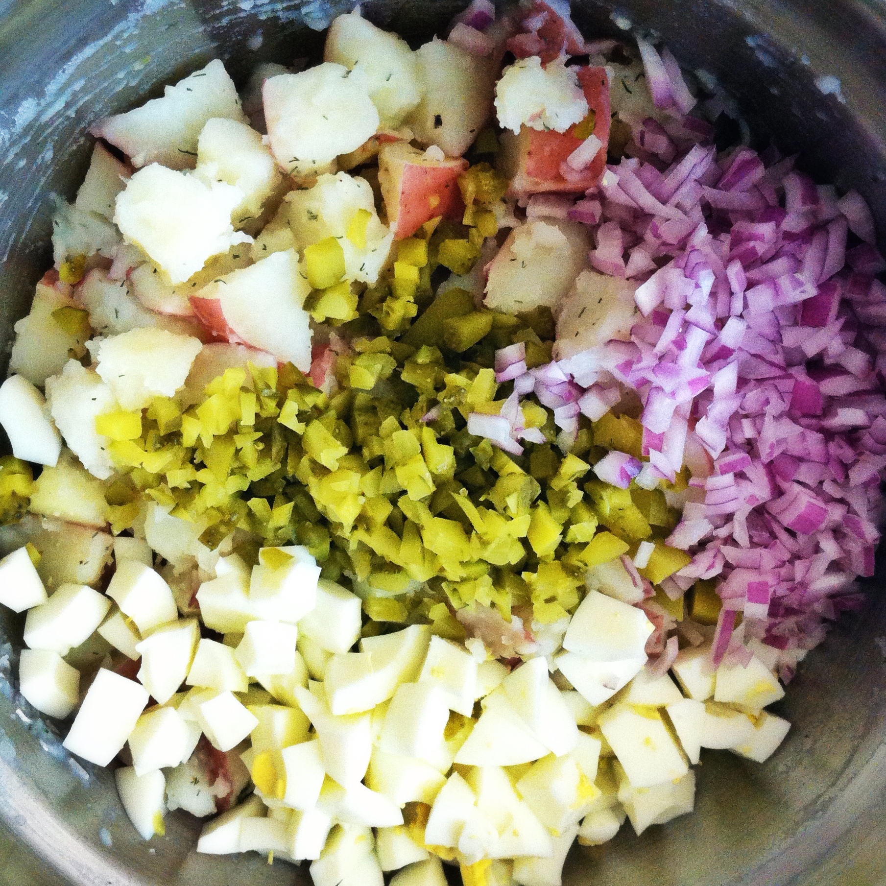 Chop/dice the celery, pickles, onion and eggs and add them to the marinated/chilled potatoes. Toss to combine.