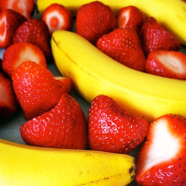 Preheat oven to 350 degrees. Line a sheet pan with parchment paper. Rinse and hull the strawberries then arrange on the prepared sheet pan with the bananas.