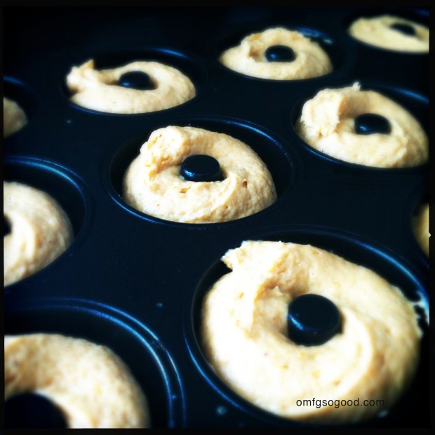 Spoon batter into a ziplock bag and snip one corner with kitchen scissors then pipe the batter evenly into the donut pan holes. Bake for 30 minutes.