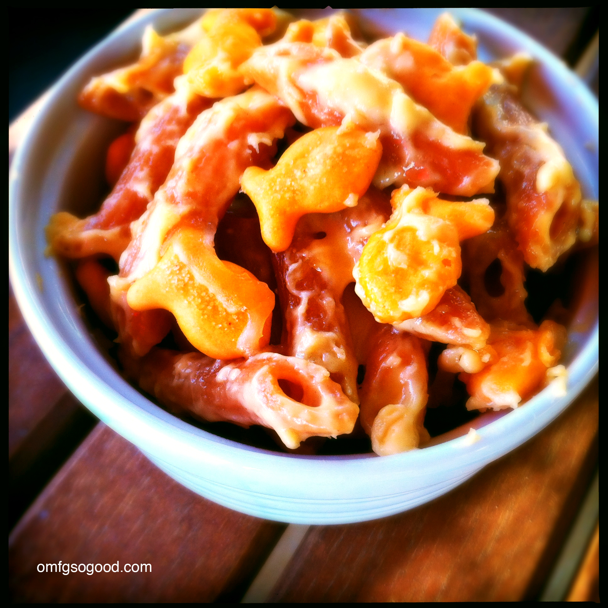 Top with Goldfish crackers (and a little extra shredded cheese if that’s how you roll) and bake in the preheated oven for 30 minutes (uncovered).