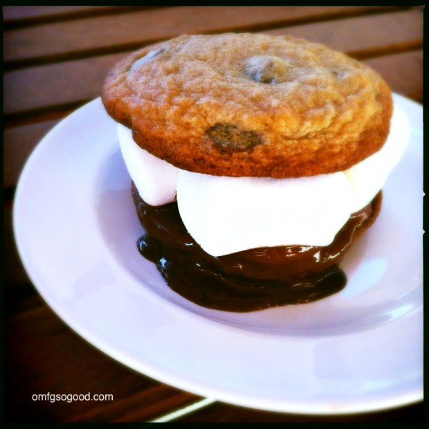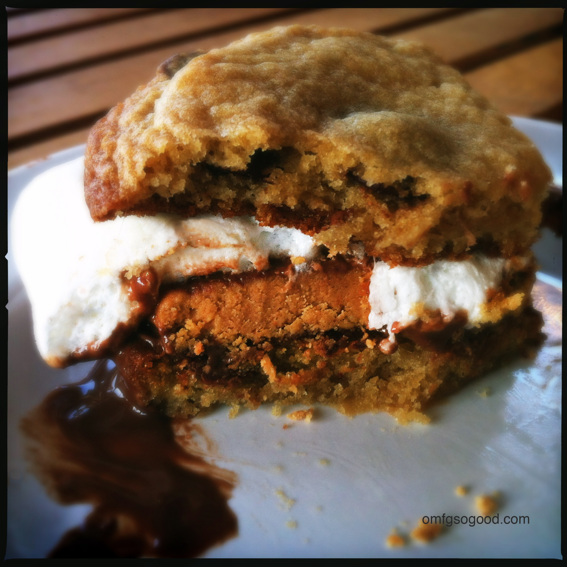 Now, these are delicious on their own. Don’t get me wrong. But the goal here is to use up some of the evil Peanut Butter Cups lingering on top of the fridge. So, grab two of the warm cookies, a peanut butter cup and a few large marshmallows then sandwich it all together.