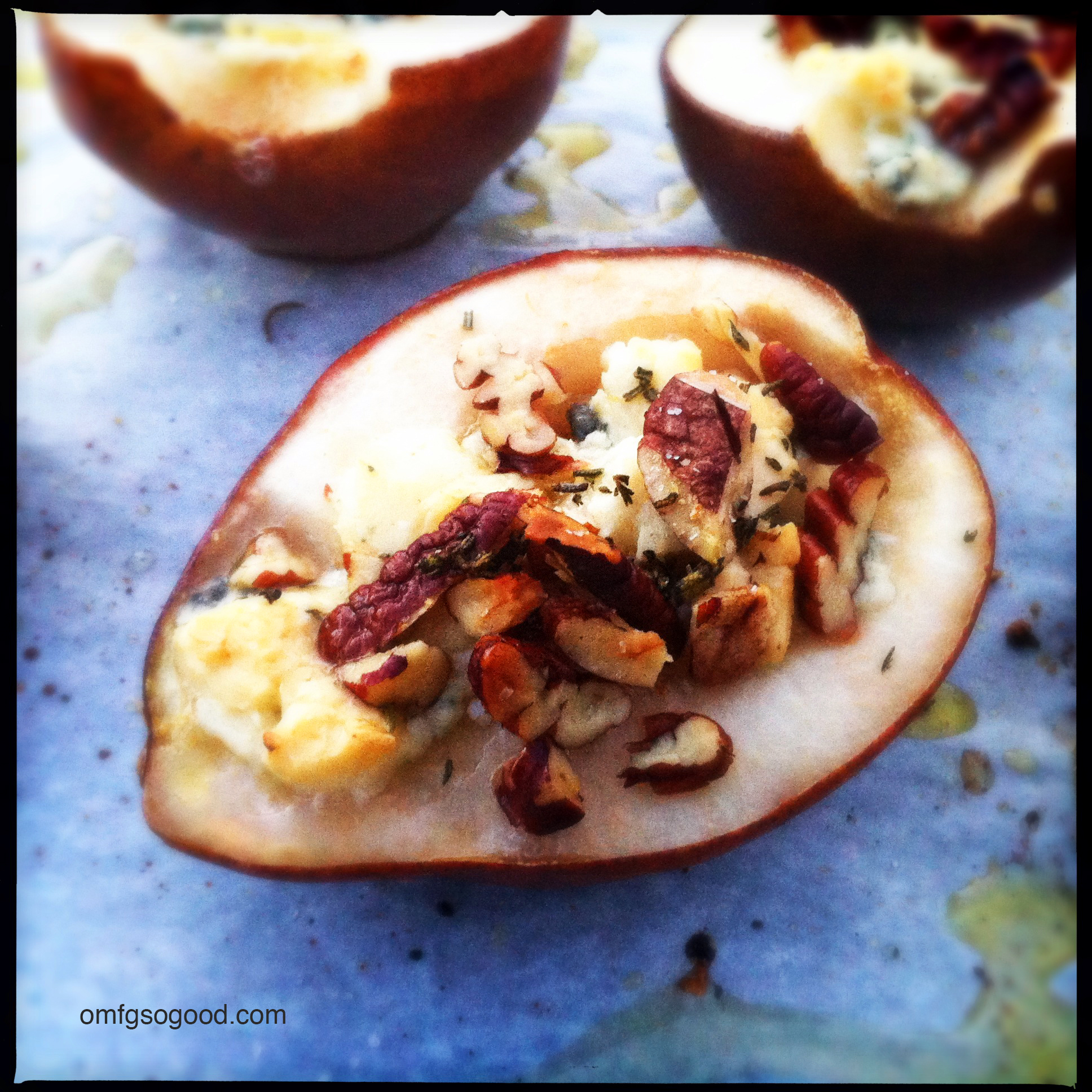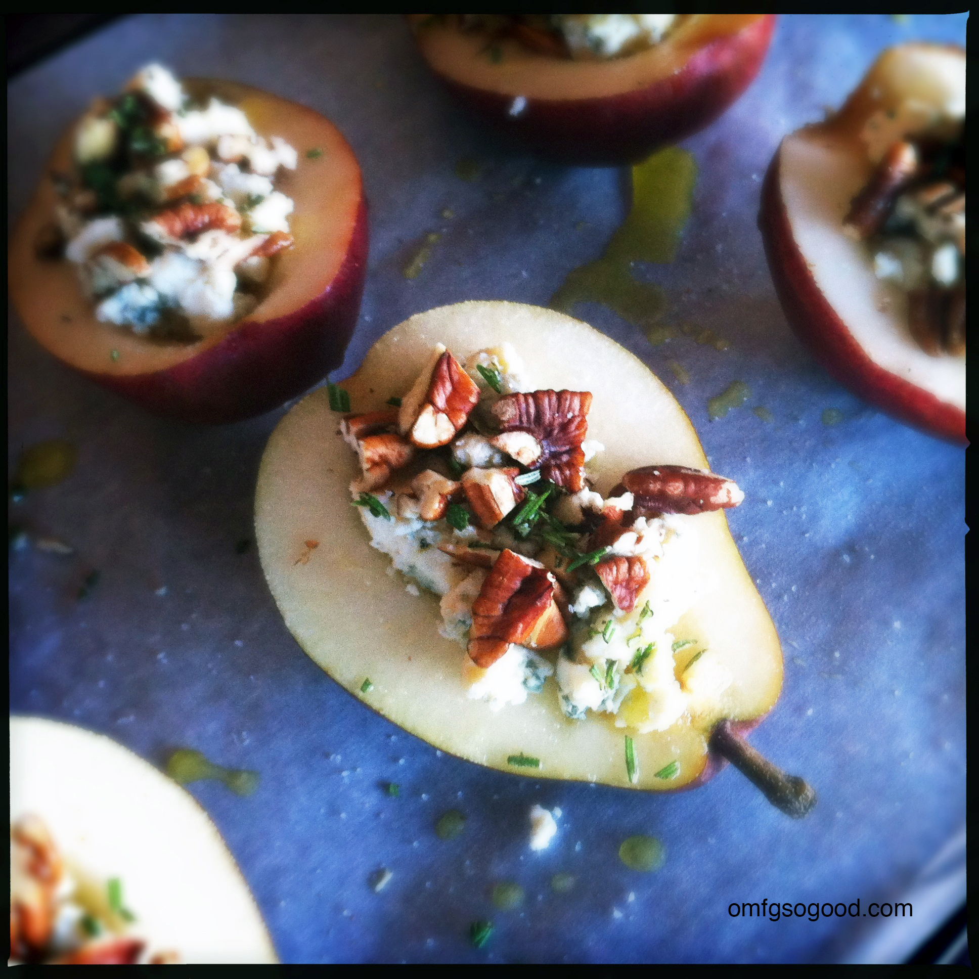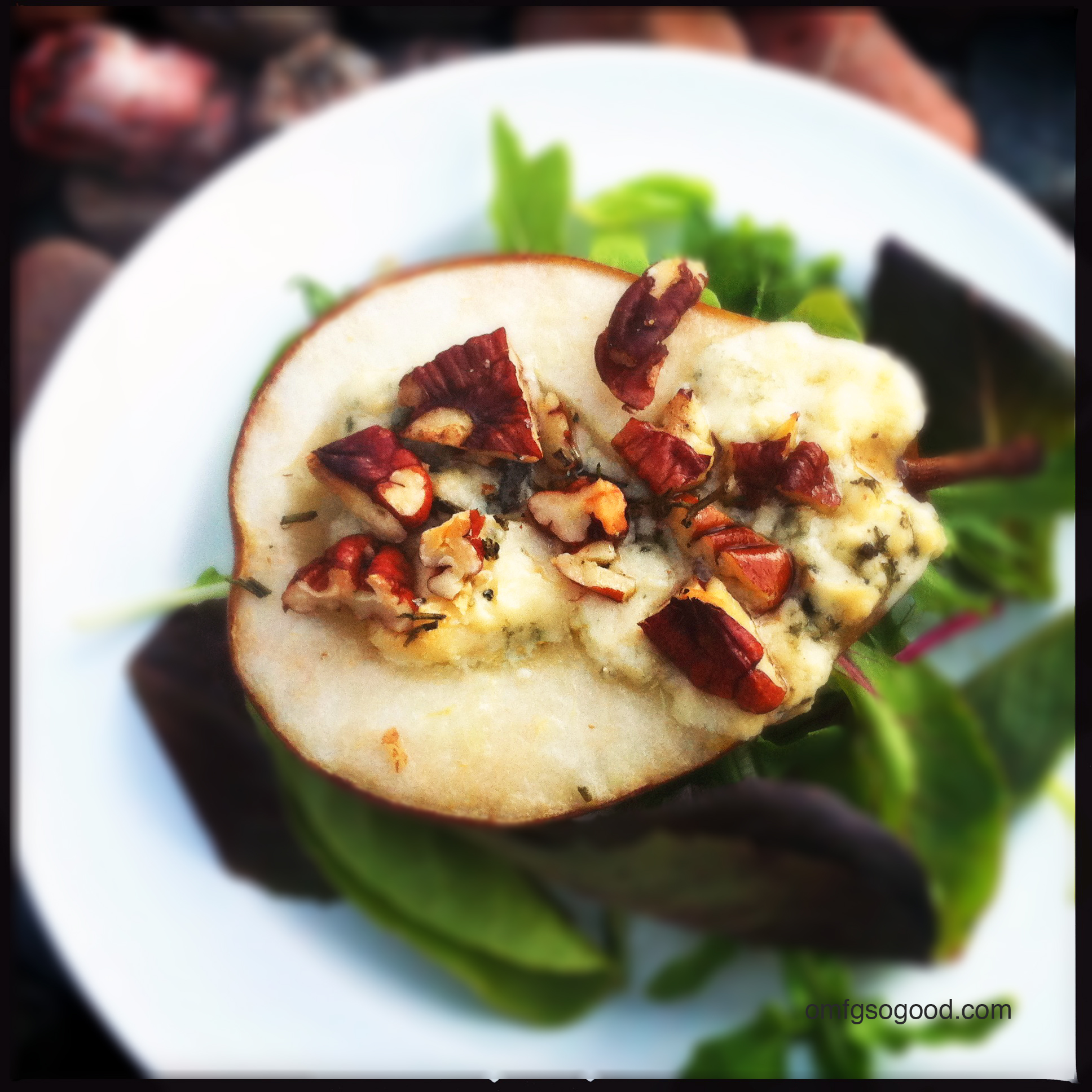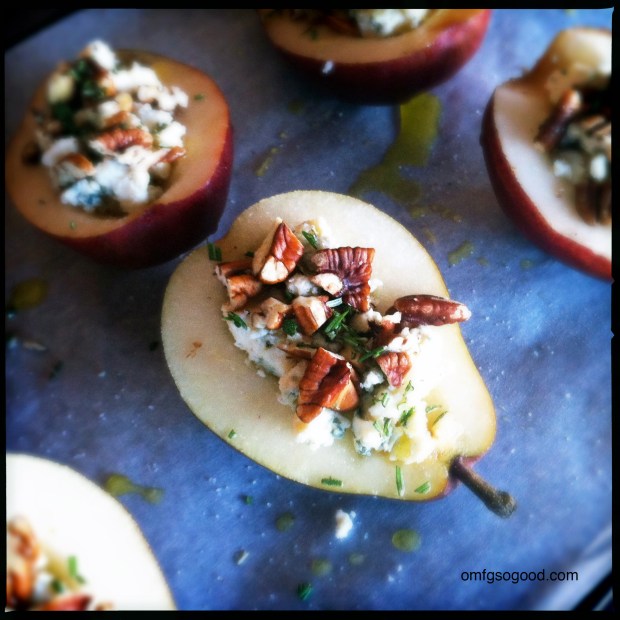These are delicious alone or served over a small bed of fresh micro-greens. The combination of tastes and textures is fantastic… sweet juiciness from the pears, creamy bite from the cheese, and earthy crunch from the pecans. So good. SO GOOD.