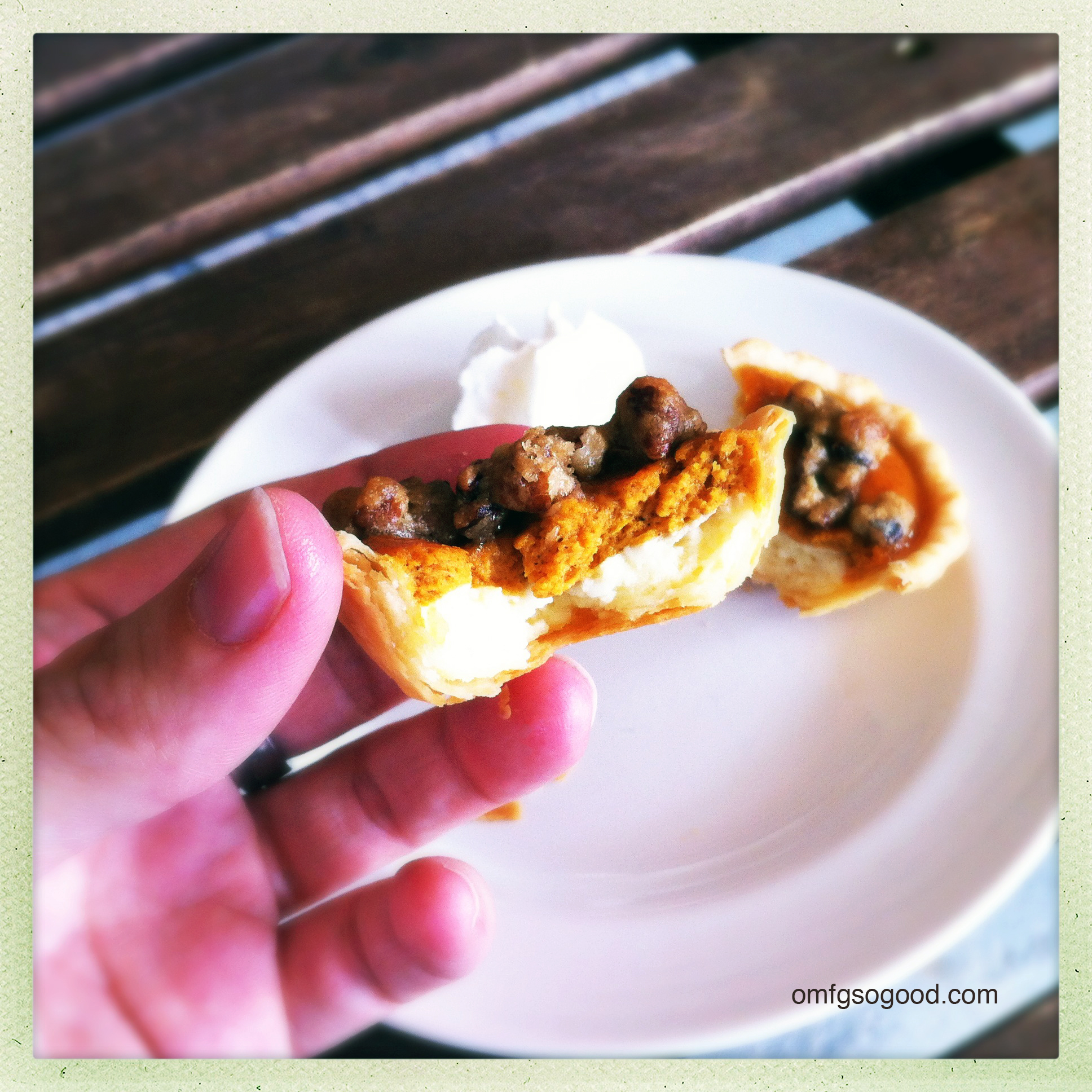 These mini treats are my adapted version of her layer of cheesecake topped with a layer of spiced pumpkin… with the added layer of crunchy pecan streusel.