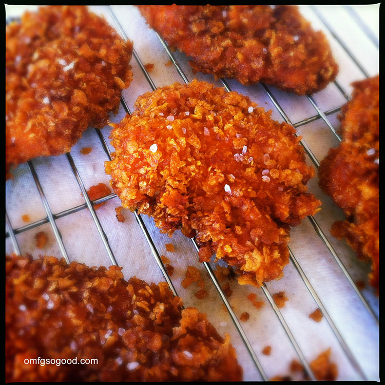To prepare the chicken, dredge each breast in the flour first, then dunk to cover completely in the wing sauce, then into the Corn Flake bowl and flip to coat evenly. (I may have even pressed the crushed cereal in just a little so I could get a good, thick coating of them on the chicken. Yup, I likes me some SUPER CRUNCH.)