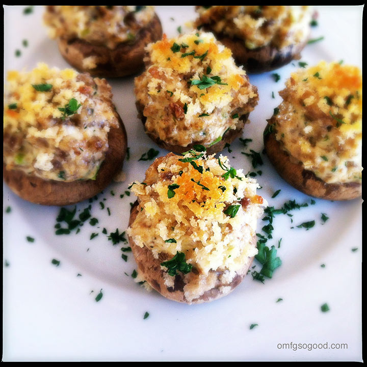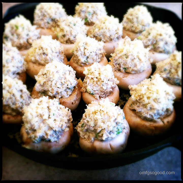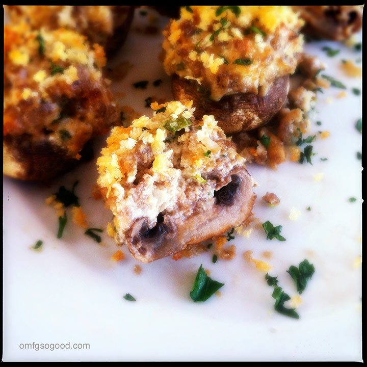 Every time we have a dinner ‘thing’ at our place, my friend Darren brings stuffed mushrooms. And, it never fails, while everyone else is distracted by sips of wine and talk of vinyl record albums (yeah, we’re hipster dufuses) I eat half the plate of the damn things. Then I make myself scarce when everyone else meanders back to the kitchen.