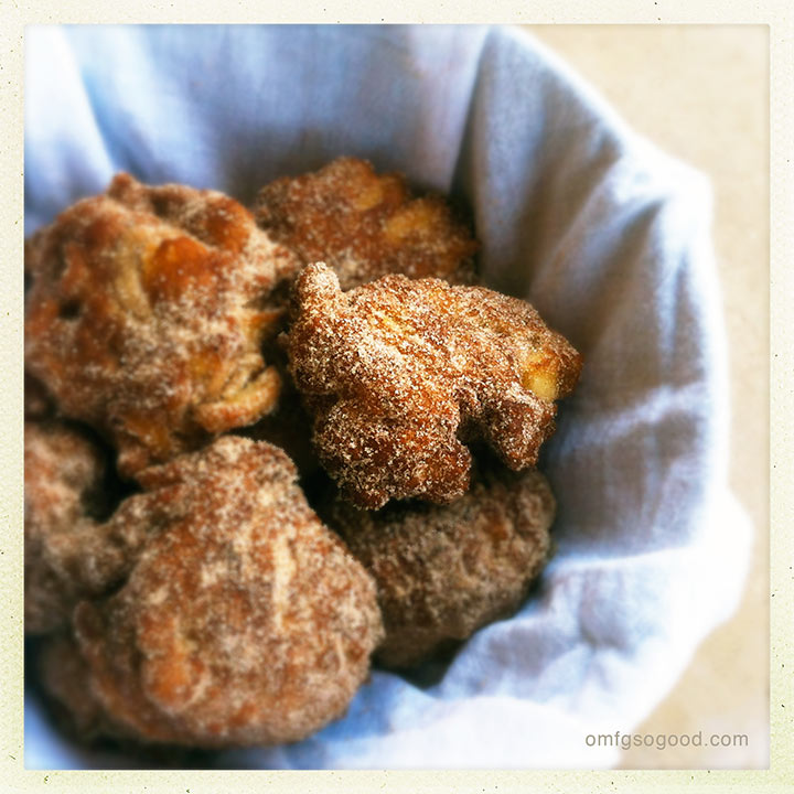 My mom used to make us fresh apple fritters when I was just a wee lass living in an old (possibly haunted) farmhouse in Upstate New York. I remember standing on a chair at the counter, waiting for them to cool just enough to toss them into a sack filled with the perfect blend of cinnamon sugar. Then it was my job to shake the bag. And eat them.