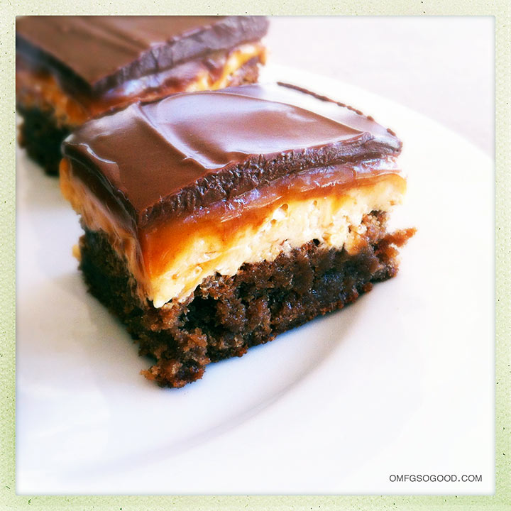 Remove the caramel & nougat covered brownies from the freezer and pour the melted peanut butter chocolate over the top. Spread to an even layer and refrigerate for at least an hour (or throw it back in the freezer if you’re really eager for a bite) before cutting into squares.