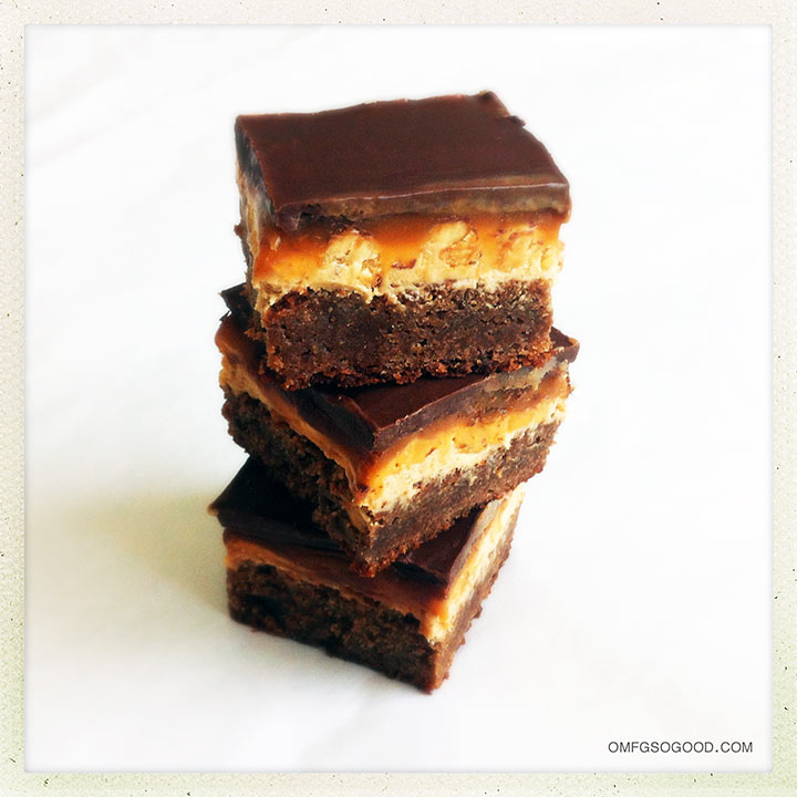 Lately I’ve seen a ton of Snickers Fudge recipes floating around Pinterest. So, I started there, tweaked and refined, then added my own perfect fudgy brownie as foundation… for amazingness.