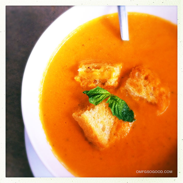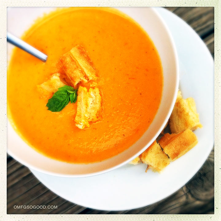 Roasted Tomato and Basil Soup with Grilled Cheese Croutons