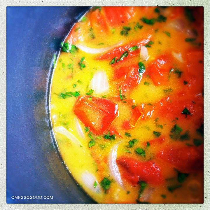 Add the heavy cream and stir to combine, then simmer over low heat while you make the grilled cheese croutons (aka, the best idea I’ve had today.)