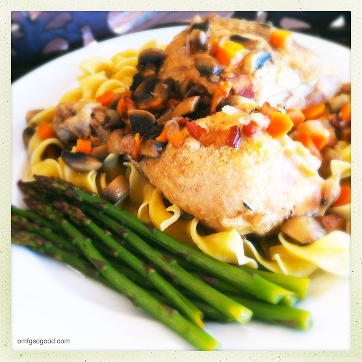 This Chicken Riesling didn’t photograph as well as I’d hoped. (Blame that on the glaring Arizona sun.) But, it tastes absolutely amazing. I mean, come on, how could it not? Thick cut bacon, mushrooms, garlic, fresh carrots, onion, BACON, and pan seared chicken, slowly simmering in the perfect combination of seasoned chicken stock and sweet white wine. So. Good.