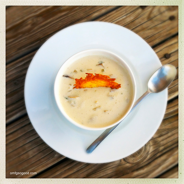 Spoon some delicious, shroomy soup into your bowl and top with a pretty little parmesan crisp..