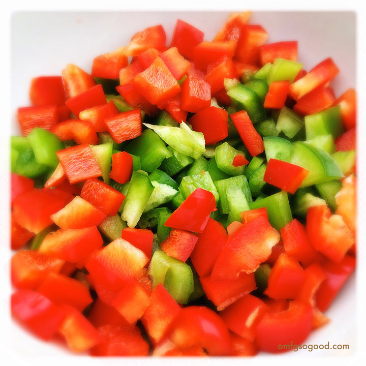 To cook the peppers, chop both the red and green into small bite-sized pieces…