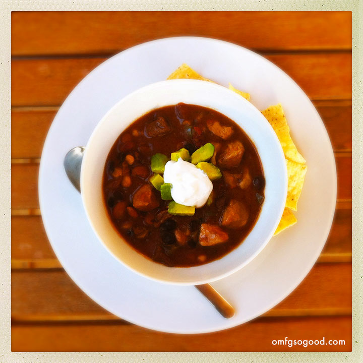 As far as chili goes, I’m not a huge fan of an overly tomato sauced base. In fact, some die-hard chili buffs may argue that this isn’t technically chili because it has no tomato sauce. I’m going to argue my case with a heavy dose of cumin, chili powder and cayenne… along with a good helping of chopped tomatoes mixed with green chilies. Throw in a couple of types of beans and two, yes, I said two, kinds of meat… and you’ve got yourself quite a winning team.