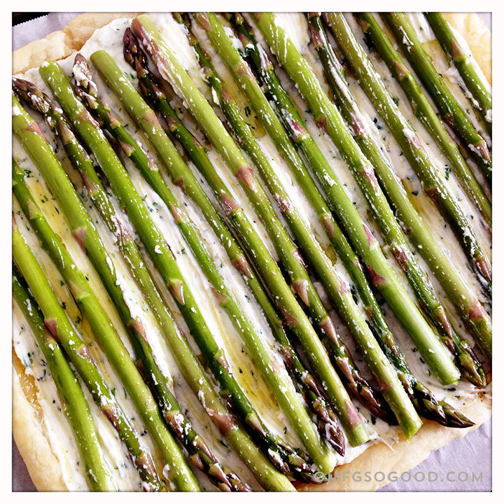 So, until the glorious day arrives when we can appreciate the gluttony of brunch as a family, I’ll have to peruse all of my favorite brunch themed cookbooks (like Breakfast for Dinner) to come up with some options at home. Options like this deliciously bright roasted asparagus and pancetta pastry tart…