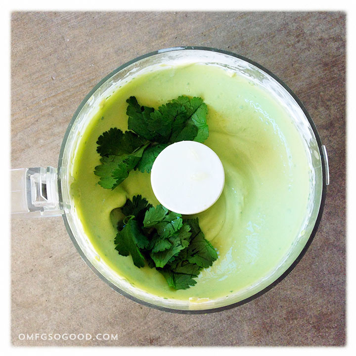 To make the avocado crema, scoop the avocado into the bowl of a food processor and add the sour cream and lime juice. Pulse to blend until smooth and free of lumps, then add the cilantro.