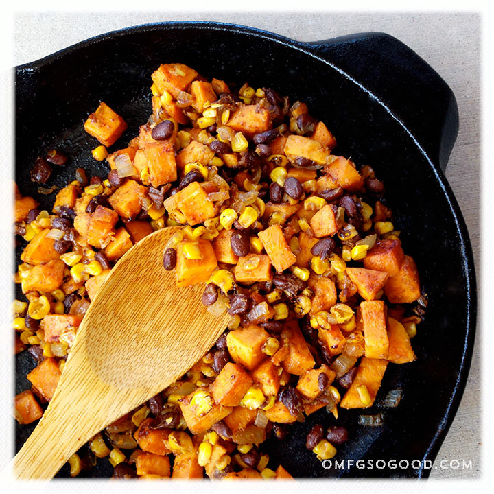 Now, back to the taters. In a large skillet, over medium heat, saute the diced onions until softened. Add the black beans, corn and roasted sweet potatoes and gently toss to combine. Cook over medium heat until the beans and corn are warmed through. At the very end, add the cubed avocado to the pan and squeeze lime juice over everything. Gently toss to combine.